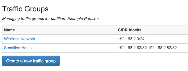 FlowTraq uses Traffic Groups to represent the logical makeup of your network in terms of sections of netblocks and/or individual IP addresses. These groupings form the basis of alerting policy for FlowTraq, and for long-term trend analysis, and they also provide a convenient granularity between the netblock and autonomous system level when examining your traffic. The addresses in these groups are independent of the "internal" addresses at the partition level; any individual Traffic Group may contain a mix of internal addresses, or none at all.