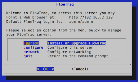 The FlowTraq virtual appliance update routine is simple, and performs the recommended steps of a web portal upgrade automatically. Log into the virtual appliance console, and select upgrade from the main menu.