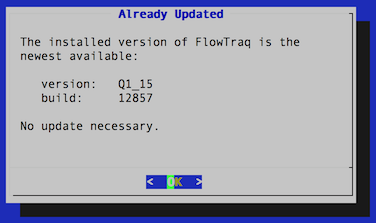 The upgrade routine will contact FlowTraq to determine the most recent release and download that release. If there is no new version available, the routine will display the current server version and then bring the user back to the main menu.