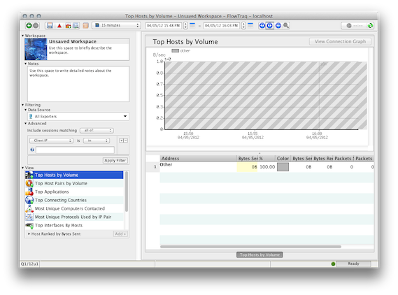 Check the Exporters tab in the configuration panel. If your NetFlow v9 or IPFIX exporter is shown there, it has successfully sent traffic to FlowTraq Server. However, it may still be waiting for a template record, and until that time, no sessions will appear.